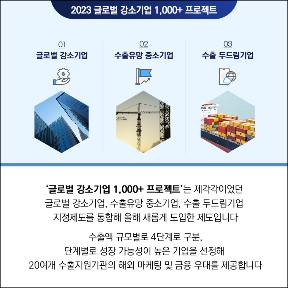 ‘글로벌 강소기업 1,000+ 프로젝트’는 기존에 선정 절차, 일정, 기준 등이 제각각이었던 글로벌 강소기업, 수출유망 중소기업, 수출 두드림기업 지정제도를 통합하여 2023년에 새롭게 도입한 제도입니다.