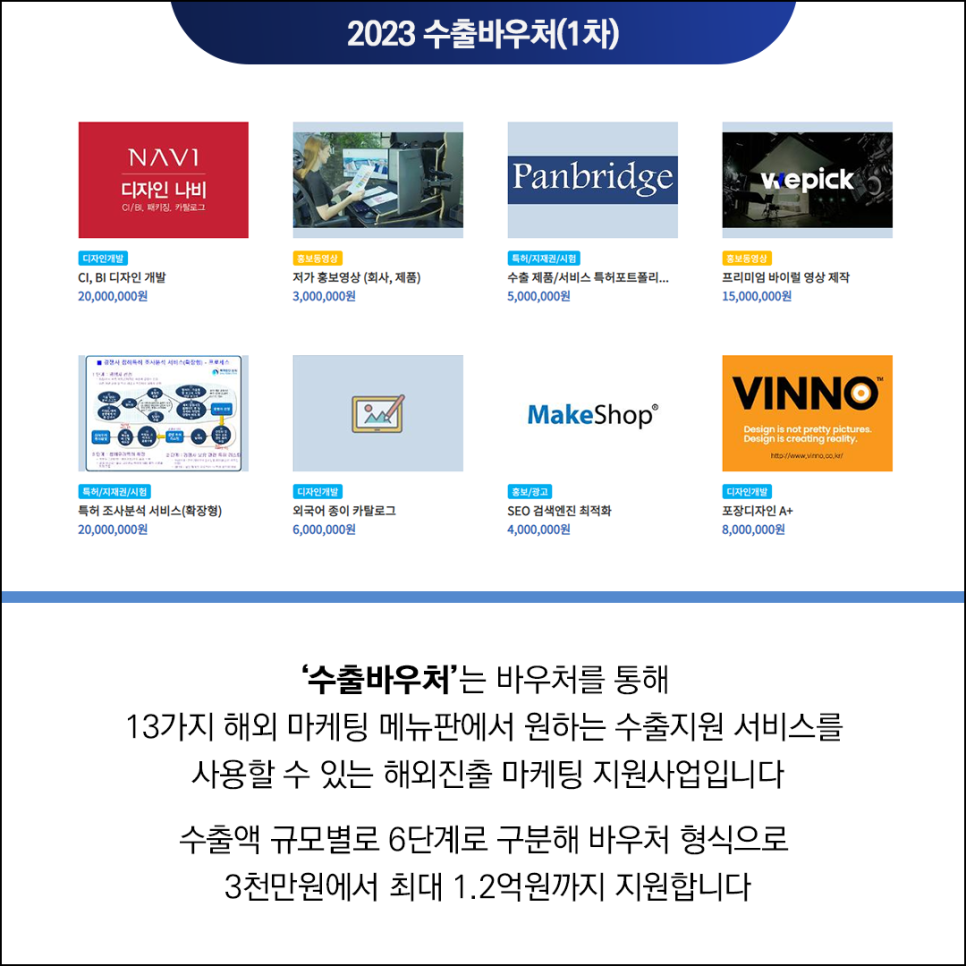 *디자인 개발, 홍보 동영상, 해외규격인증, 특허, 홍보·광고, 조사·일반 컨설팅, 법무·세무·회계 컨설팅, 브랜드 개발·관리, 국제운송, 통번역, 전시회·행사, 서류대행, 역량강화 교육 수출바우처도 수출액 규모별로 ‘내수(수출액 0) – 초보(10만달러 미만) – 유망(10만달러~100만달러) – 성장(100만~500만달러) – 강소(500만달러 이상) – 강소+ (1,000만달러 이상)’ 6단계로 구분해, 해외 진출시 필요한 마케팅 서비스를 바우처 형식으로 3천만원에서 최대 1.2억원까지 지원합니다.