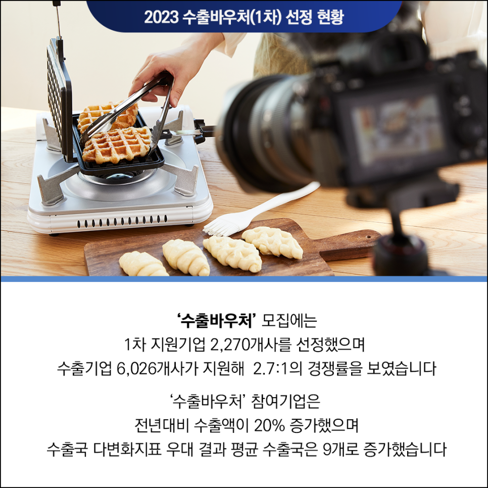 '수출바우처' 모집에는 1차 지원기업 2,270개사를 선정했으며 수출기업 6,026개사가 지원해 2.7:1의 경쟁률을 보였습니다.