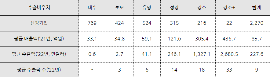 '수출바우처' 참여기업은 전년대비 수출액이 20% 증가했으며 수출국 다변화지표 우대 결과 평균 수출국은 9개로 증가했습니다.