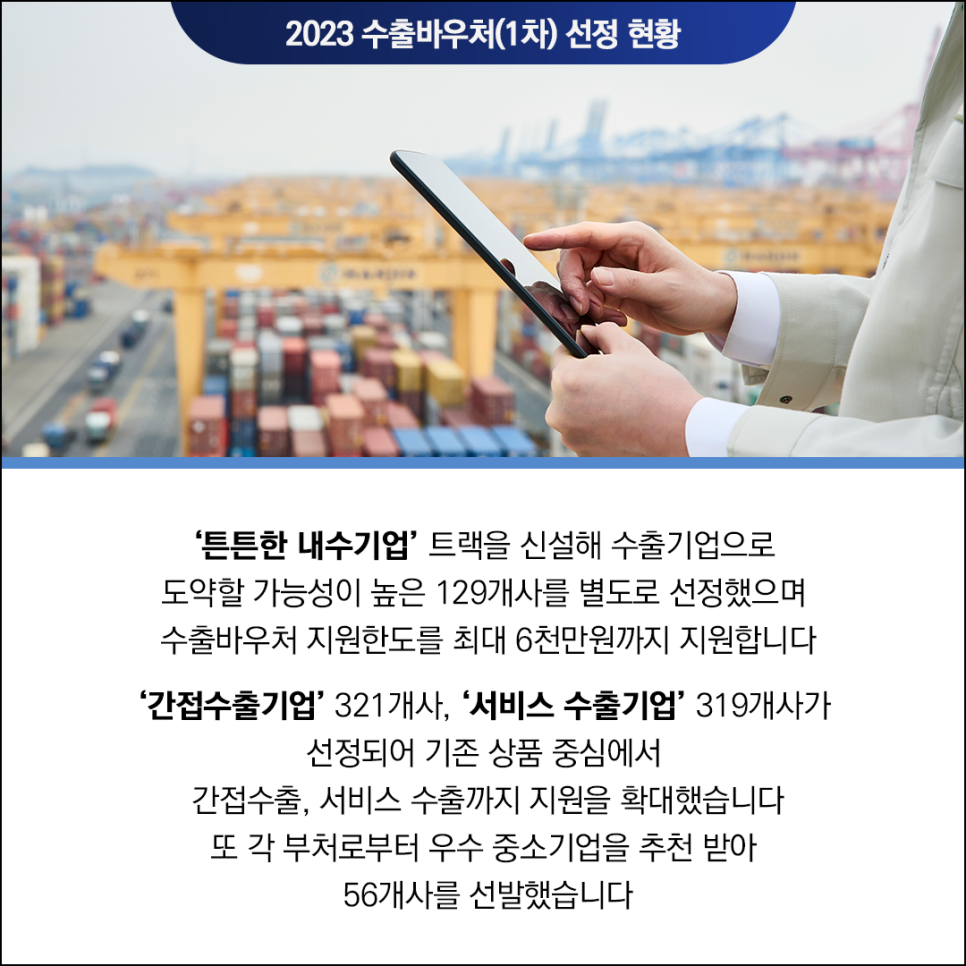 내수기업을 수출기업으로 육성하기 위해 ‘튼튼한 내수기업’ 트랙을 신설하여 내수기업 중 간접수출 실적이 우수한 기업, 예비·아기유니콘, 팁스·포스트팁스 기업, 초격차 스타트업 등 수출기업으로 도약할 가능성이 높은 내수기업 129개사를 별도로 선정하였으며, 해당 기업에 대해서는 수출바우처 지원한도를 2배 확대하여 최대 6천만원까지 지원합니다.